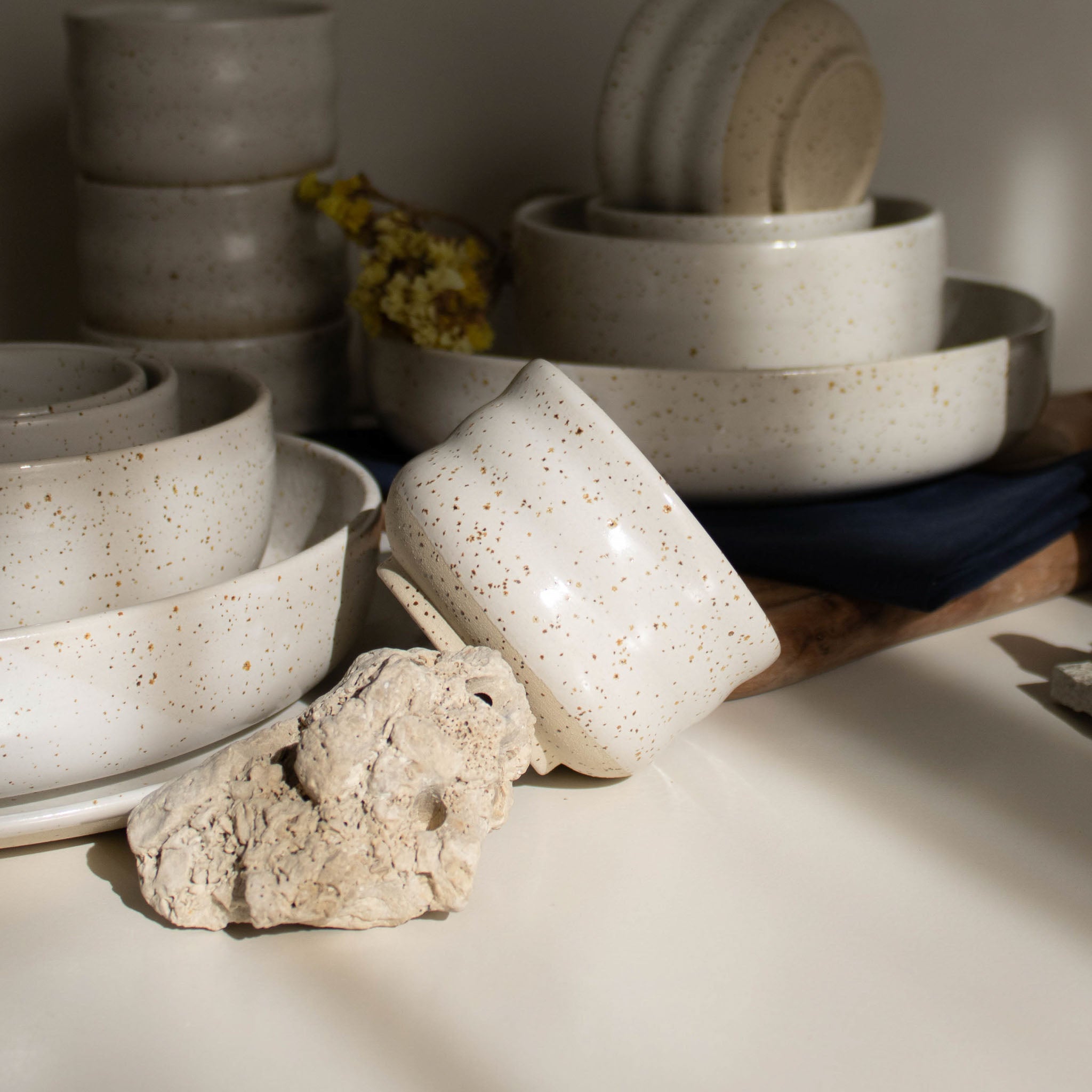 Svaka šolja je izrađena potpuno ručno, na grnčarskom točku. Prirodna lepota i tekstura krem tačkaste gline diskretno se naziru ispod saten mat bele glazure, u svojoj razigranoj kompoziciji tamnih tačkica.
