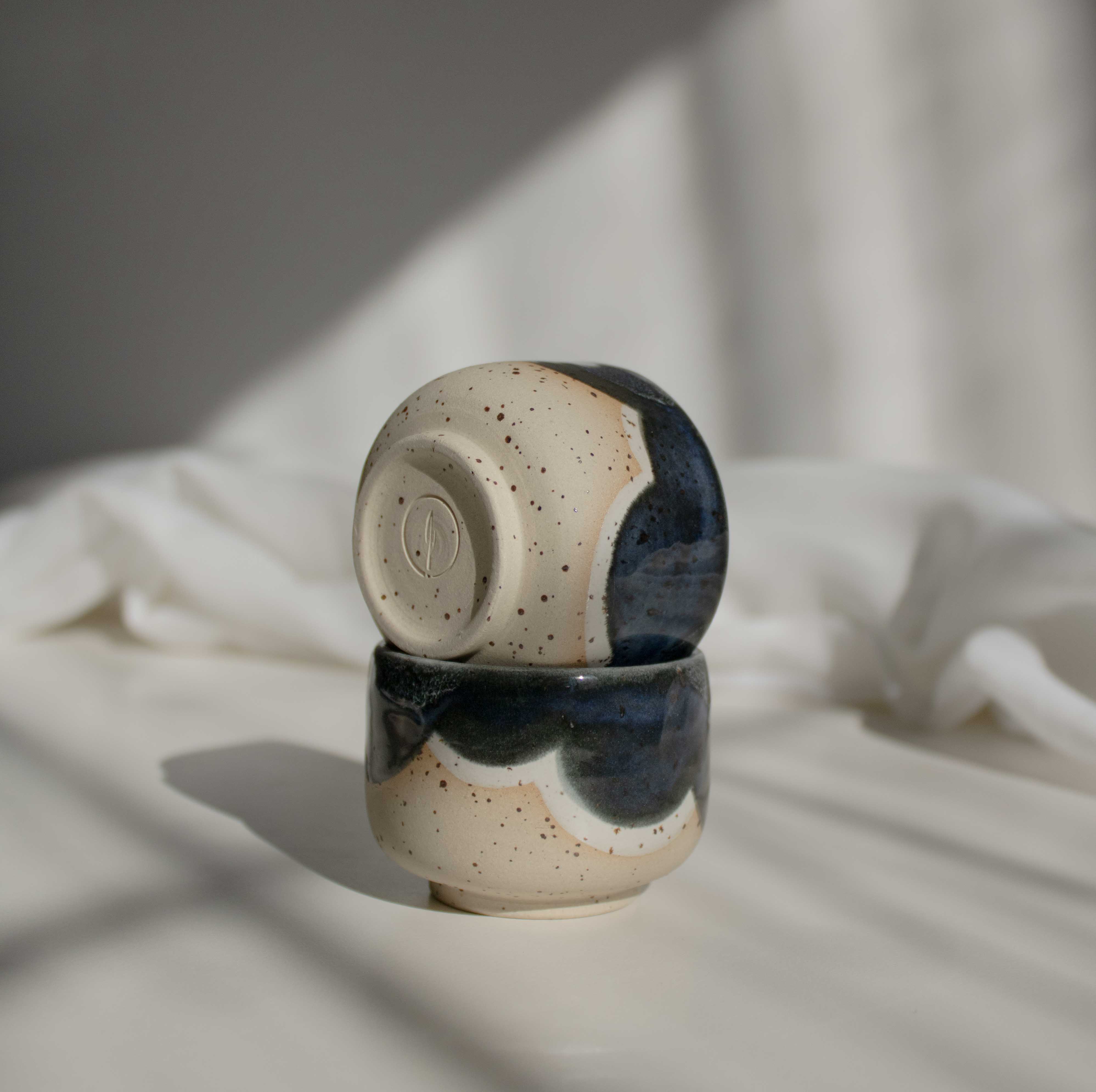 Each cup is made purely by hand, on a potter’s wheel. The natural beauty and texture of speckled cream clay is discretely revealed in a playful composition of dark speckles beneath rich layered tones of white and midnight blue glaze.