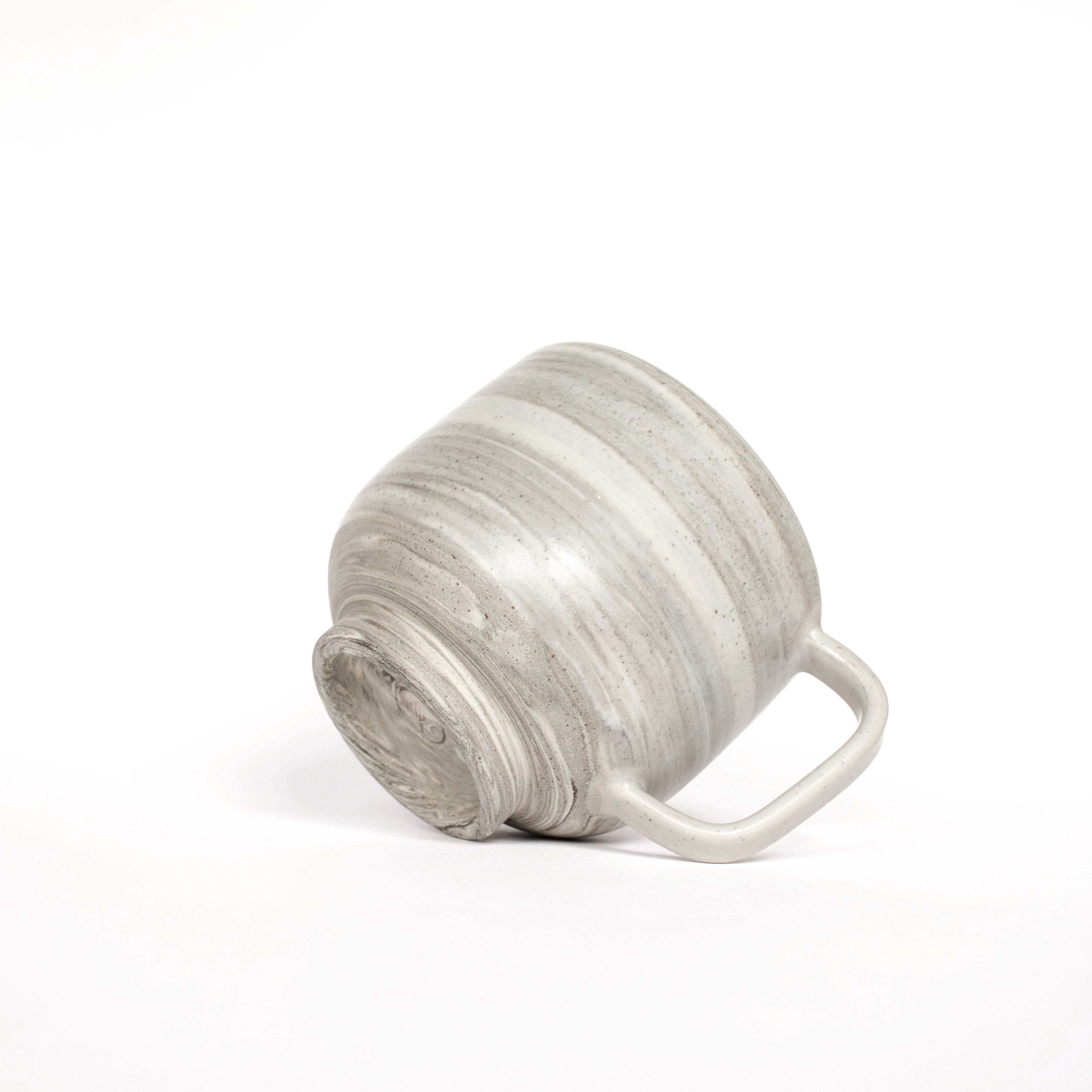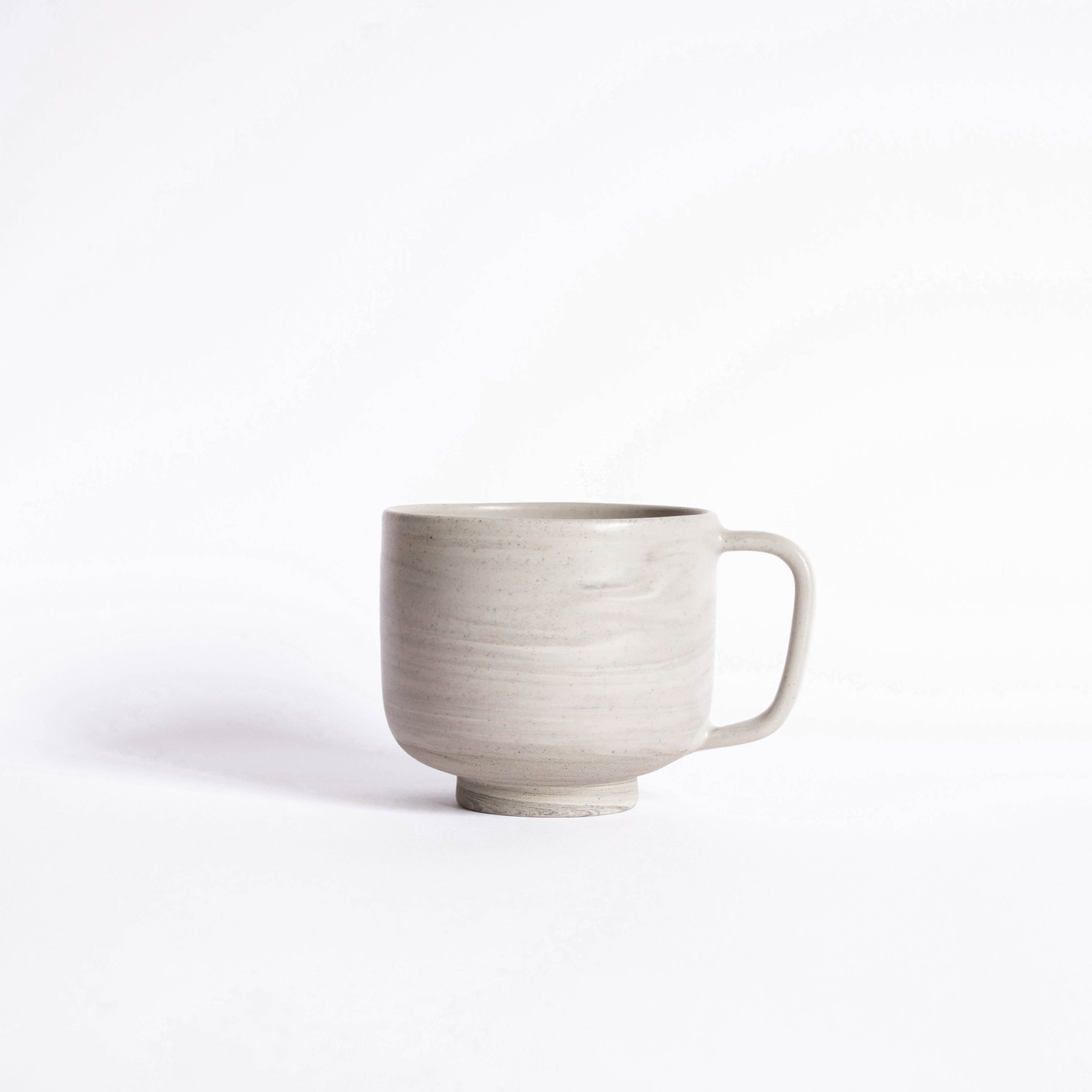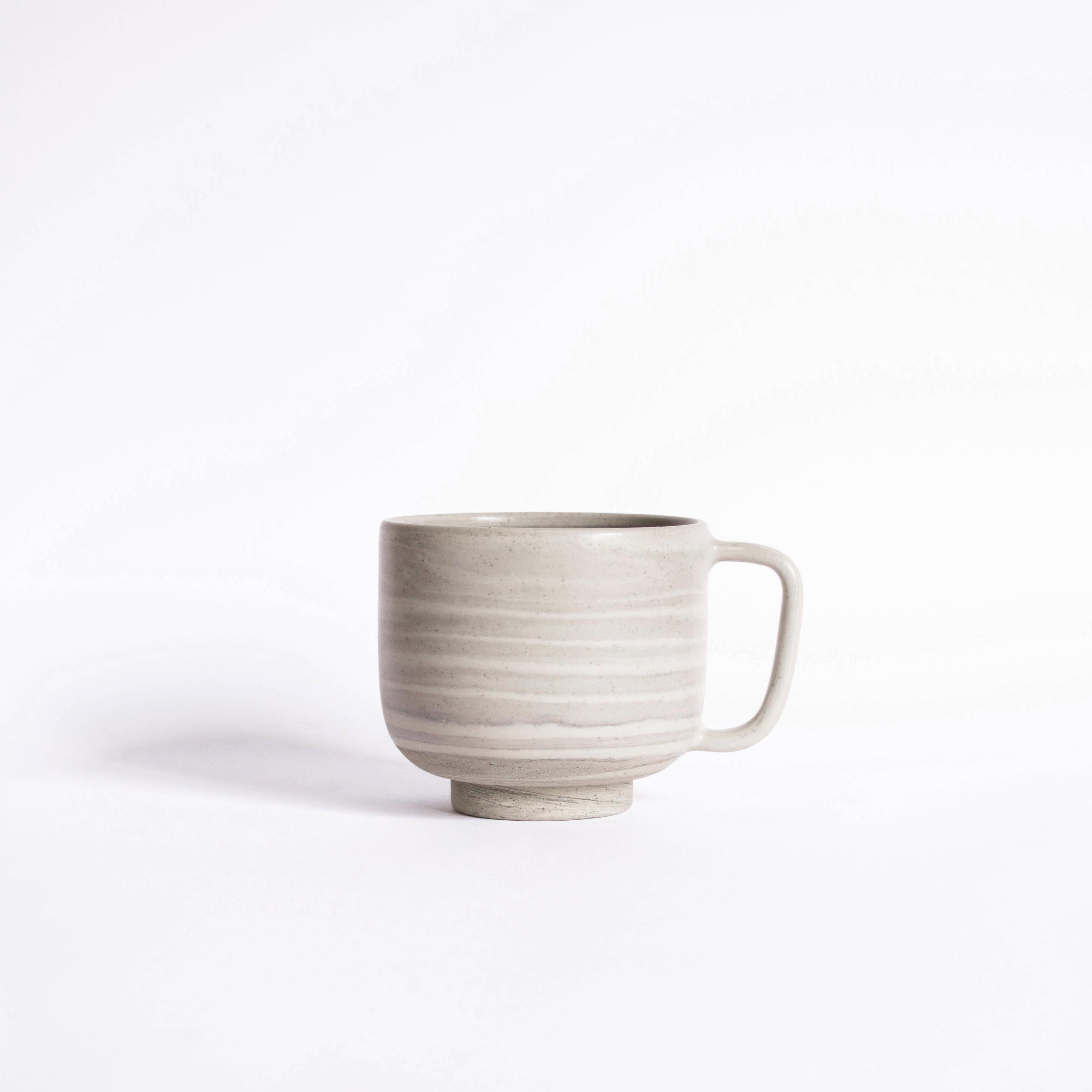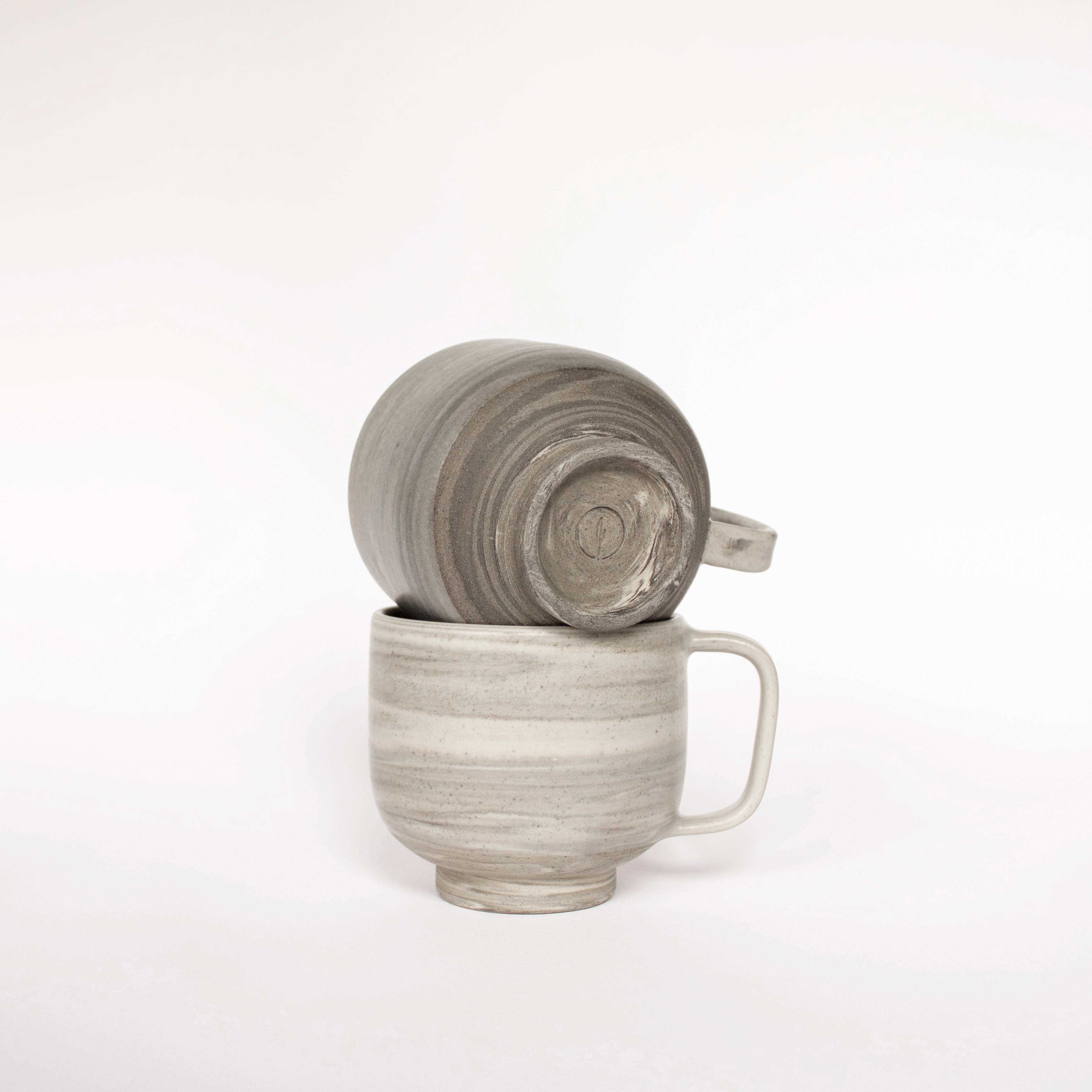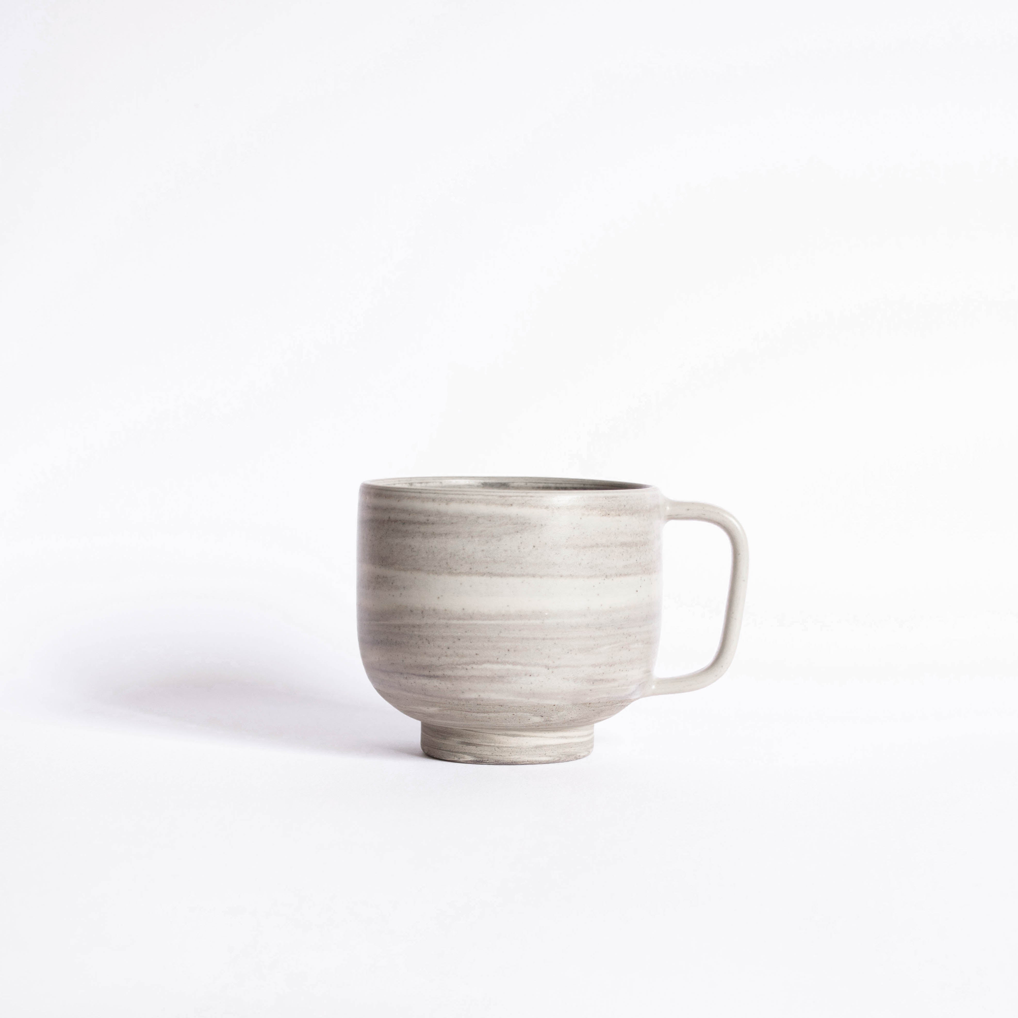 Each cup is made purely by hand, on a potter’s wheel. The natural beauty and texture of the clay blend is fully revealed in a playful composition of organic swirls and streaks beneath satin matte transparent glaze.